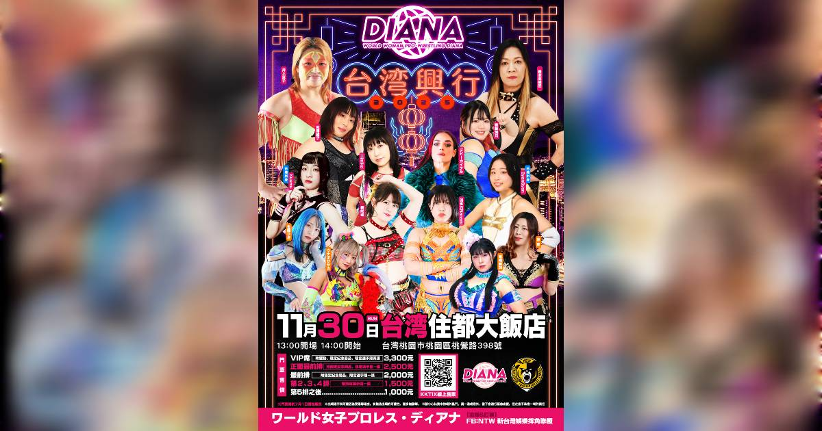 日本知名女子職業摔角團體 DIANA Pro-Wrestling,將於 11月30日(星期日) 在 桃園住都大飯店 舉辦精彩賽事,這是 DIANA 第二次來台舉辦比賽,勢必再度掀起女子摔角熱潮!